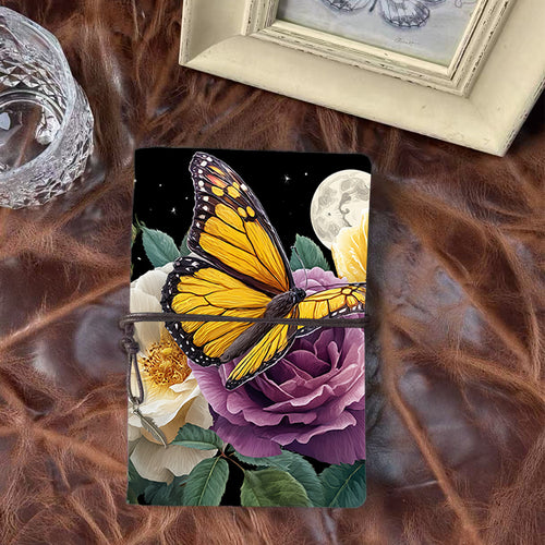 1 Handmade A6 Notebook with Retro Yellow Blank Papers, Tether Closure & Metal Pendant, Metal Hinge Clip for Office with Butterflies and peon