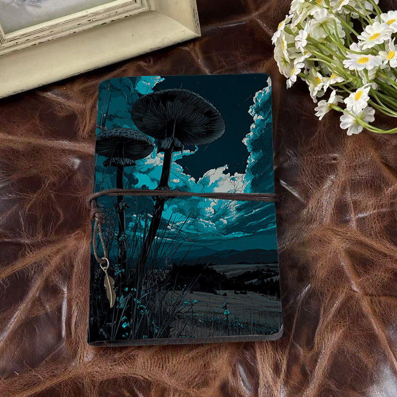 Handmade A6 Notebook - 80 Sheets, Metal Binder, Tether Closure with Metal Pendant, Ideal for Office Work with Mushrooms, clouds, grass, nigh