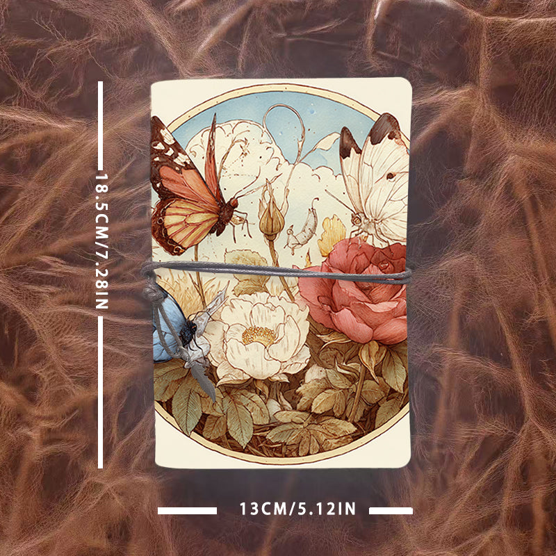 Handmade Office A6 Notebook, Metal Loose - leaf, 80 Sheets, Vintage Tether w/ Metal Pendant, Vintage Yellow Paper with Butterflies, roses,