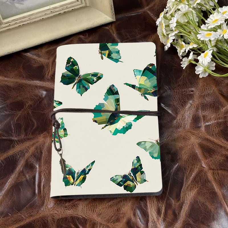 A6 Handmade Notebook, Metal Loose-leaf, 80 Sheets, Tether & Metal Pendant, Business Meeting Use with Green - hued polygonal butterflies Prin